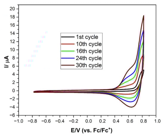 Voltammograms of polymerization of M3 carried out potentiodynamically with upper potential as high as 0.82 V, with sweep rate ν = 100 mV/s, 0.1 M Bu4NPF6 in CH2Cl2.
