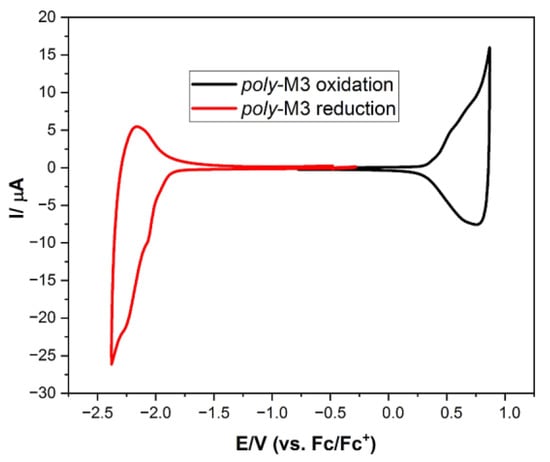 Voltammograms of poly-M3 (polymerization carried out potentiodynamically with upper potential as high as 0.82 V) with sweep rate ν = 100 mV/s, 0.1 M Bu4NPF6 in CH2Cl2.