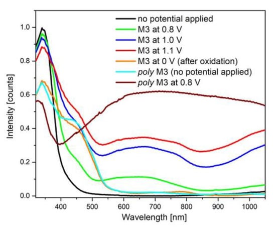 In the next step, a series of spectroelectrochemical experiments with external potential slightly above oxidation potential were conducted. In the case of compound M3, oxidation is an irreversible process, causing the electropolymerization of the specie.
