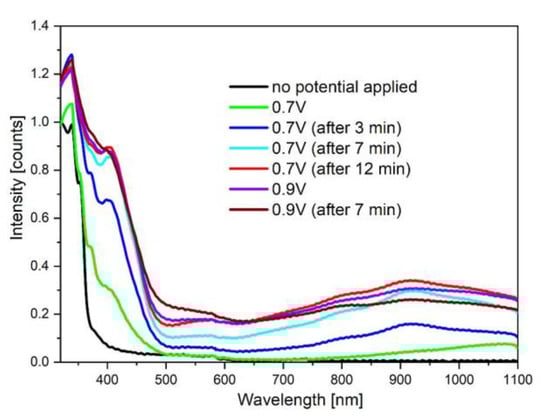In the first stage of the oxidation process, an additional band appears and grows in the 400–500 nm range (see Figure 9). At this potential, the monomer dimerization leads to the formation of the quaterthiophene bridges. Moreover, the polaronic band [49,50] is also observed (it is, however, of low intensity). On the other hand, when the external potential is raised to 1.1 V, more visible changes occur, and the spectrum becomes characteristic for the doped polymer [51,52,53]. As expected, when the external potential is restored to 0V, the appearance of the spectrum does not return to its original appearance, but an additional band (within 400 and 500 nm) is maintained. It is worthy of note that the polaronic band disappears completely. Next, as a comparison, the electropolymerization on the ITO electrode (potentiodynamically) with an upper potential as high as 0.82 V was also carried out. The resulting polymer was then also investigated spectroelectrochemicalyl in a monomer-free solution. After applying the potential as high as 1.1.V, the polymer behaves very similarly to the one obtained by the potentiostatic method. The main difference is that no evident maxima can be observed in this case, suggesting that the potentiodynamic route enforces a higher distribution of chain lengths or dimerization via the third or fourth positions of the terminal thiophene rings. Moreover, in the case of conjugated monomers, electropolymerization using the potentiodynamic route lead to materials containing short-chain oligomers [54].
