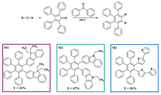 The Diels-Alder [4 + 2] cycloaddition reactions have been intensively studied for many years. However, they still enjoy great interest and open up new paths in organic synthesis. An extremely interesting variant of this reaction is the Diels-Alder [4 + 2] cycloaddition between alkynes and a cyclopentadienone. Interestingly, it takes place in two stages. First, an intermediate cycloadduct is formed, from which the CO group then departs [33,34,35]. None of the steps require the use of a catalyst. All that is needed is a high temperature of 180 °C to 350 °C [36,37]. In the case of the tested compounds (M1–M3), they were obtained in the cycloaddition reaction (Diels-Alder [4 + 2]) of an appropriate alkyne with tetraphenylcyclopentadienone (Scheme 1). All reactions were carried out at a temperature of 300 °C under an argon atmosphere. The progress of the reaction was monitored by TLC chromatography. Benzophenone was used as a solvent. Excess tetraphenylcyclopentadienone and benzophenone were easily disposed of by column chromatography. As a result of the conducted reactions, three hexasubstituted benzene derivatives (M1–M3) were obtained, with the yields in the range of 34–56%.