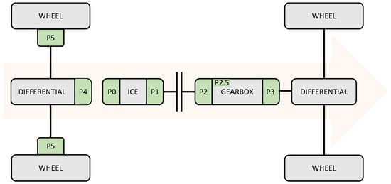 The need for reducing the impact of global mobility on the environment and the subsequent strict limits and regulations on vehicle emissions have forced a paradigm shift in automotive technology, especially in the powertrain. Alternative architectures have gained traction in the automotive market, with sales shifting away from pure internal combustion engine (ICE) layouts and toward electric vehicles (EVs) and hybrid electric vehicles (HEVs). In this context, HEVs represent an intermediate solution between conventional combustion and electric power sources. As a matter of fact, while meeting the regulatory demands, HEVs are efficient and well accepted by a large slice of users who are still skeptical about the complete electric transition given the high costs, limited range, and long charging periods [1,2,3,4]. Many types of HEVs are now present in the market. They all exploit ICE and one or more electric machines (EMs) and can be classified into micro, mild, full, or plug-in, based on the rated power and off-vehicle charging possibilities. The EMs provide traction torque to the vehicle in motor mode, while they recuperate the braking energy in generator mode. Additionally, EMs could be used as an alternator to recharge the battery by absorbing the additional power produced by the ICE in the so-called load shifting mode. Another classification, from P0 to P5, is based on the position of EMs along the driveline [5,6,7,8], as illustrated in Figure 1.