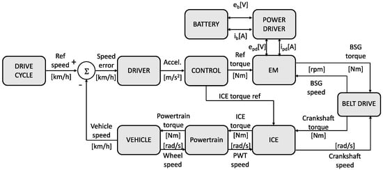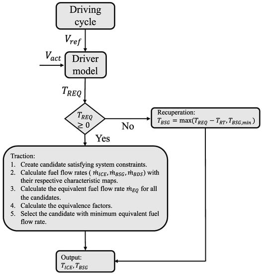 The adopted process flow for the ECMS-based EMS is shown in the flow chart illustrated in Figure 12. EMS provides references to ICE, EM, and brakes in traction and braking conditions. In traction, the EMS could select one of the following modes: pure ICE mode, pure EM mode, or ICE with EM boost assistance or regeneration.