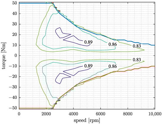 Torque/speed characteristic of the electric machine with an efficiency map.