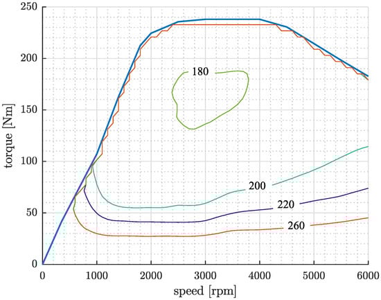 The electric machine is a brushless direct current electric motor (BLDC) with a peak power of 13 kW in boost and recuperation and a maximum torque of 50 Nm. The EM is modeled by the torque speed characteristic, efficiency map of the machine (Figure 3), and its inertia. The EM can be used to recover energy from braking and, during traction, it can assist the engine by providing a portion of the requested torque. Additionally, it can operate in generator mode to absorb the surplus torque generated by the engine, thus making the engine operate in the optimal region, in the so-called load shifting mode.