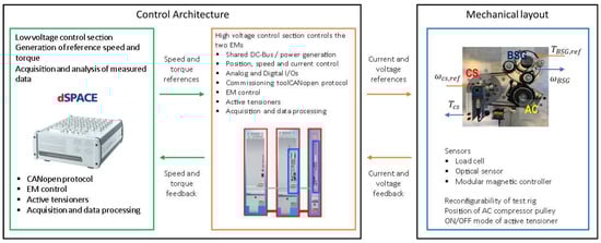 In this research, two different belts, named Belt A and Belt B, will be used to assess the robustness of the proposed controller. The BDS is characterized on a dedicated test bench [31], the layout of which is shown in Figure 5. It is based on a full electric configuration exploiting two EMs. These are Bosch Rexroth brushless motors from the IndraDyn-H series and replicate the behavior of the ICE crankshaft and the BSG. Each EM is controlled by a dedicated IndraDrive inverter. The modular power section is completed by two Bosch Rexroth inverters (HMS01.1N-W0210 and HMS01.1N-W0070). The crankshaft behavior is emulated with a 38 kW motor with a maximum speed of 12 krpm and a maximum torque of 320 Nm. The test bench is equipped with sensors to measure the system variables. The position feedback of both motors is accomplished with two Heidenhain ERM 2984 magnetic encoders (192 lines of resolution, 1 Vpp sinusoidal incremental signals, a maximum rotational speed of 47,000 rpm and a power supply of 5 Volts). The values of torque for the two electric machines are calculated from the corresponding current feedback values in the direct and quadrature axes. The angular positions of the tensioner arms are measured through two Kuebler KIS incremental encoders (2500 lines of resolution). Each encoder is hinged to its respective tensioner pulley employing a two-link kinematic arrangement. This mechanism is designed to follow and reproduce the angular displacement of the tensioner arms. The tension in both belt spans is measured on the two idler pulleys, which are equipped with Magtrol DB radial load cells (a maximum force of 750 N). Their output is fed through an HBM Force Measurement System amplifier. A power supply (HMV01.1R-W0065-A-07 by Bosch Rexroth) powers both inverters which are connected to the same DC BUS. The main feature of such a supply unit is the possibility of power regeneration at the mains, meaning that the power produced by one of the two motors acting as the alternator is given back to the network. A dSpace MicroLabBox Platform is used to support a human–machine interface that commands the inverters and acquires the signals of interest. This system communicates with a host PC via Ethernet and with both motor inverters through CAN Open protocol. The inverters receive torque or speed reference values from the MicroLabBox device. In turn, they yield the actual measurements of speed and current of both motors. In the dSpace platform, the 14-bit analog channels are used to read the load cell amplified signals, while the tensioner arm encoders are processed by direct capture inputs.