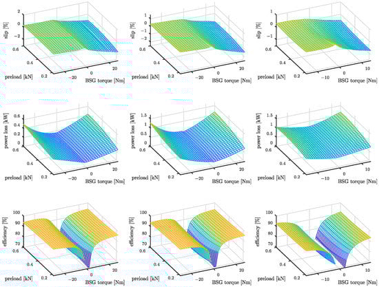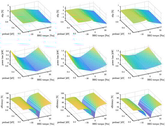 Characteristic maps of BDS with Belt B. 1st row: Slip. 2nd row: Power loss. 3rd row: transmission efficiency. The columns indicate three different values of the crankshaft speed (). 1st column: 800 rpm, 2nd column: 2000 rpm, 3rd column: 3000 rpm.
