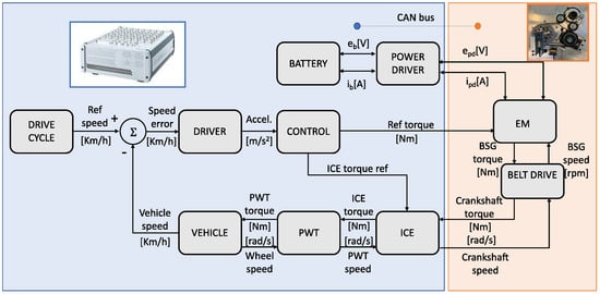 To this end, the remainder of this work is structured as follows: Section 2 describes the vehicle modeling and formulation of the proposed control strategy. Section 2.1 presents the vehicle model and parameters used in the Matlab/Simulink environment, belt drive system characterization, and HIL validation. Section 2.2 describes the procedure for the design of the energy management system considering the BDS power loss maps (ECMS-BDS) and the setup of GA for tuning the equivalence factors. Section 3 presents the performance of ECMS-BDS against standard ECMS. Finally, Section 4 draws conclusions and discusses future work.