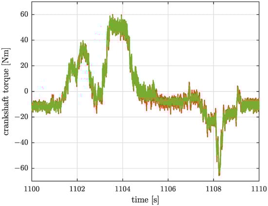 Crankshaft torque comparison. Orange line: experimental results with HIL setup; green line: numerical results.