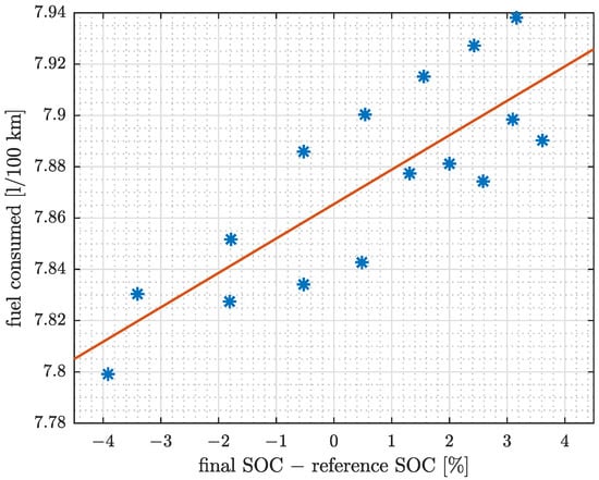 - Vehicle model simulation is performed for every candidate. The output of the simulation is the fuel consumption [ km] and . They are used to evaluate the fitness value, as:where is the consumed fuel in , is the difference between initial and final SOC, is the correction factor obtained from the fitting shown in Figure 14, and is the limit in SOC variation for GA fitness value. The is a big number to heavily penalize the fitness value for a big deviation in ().