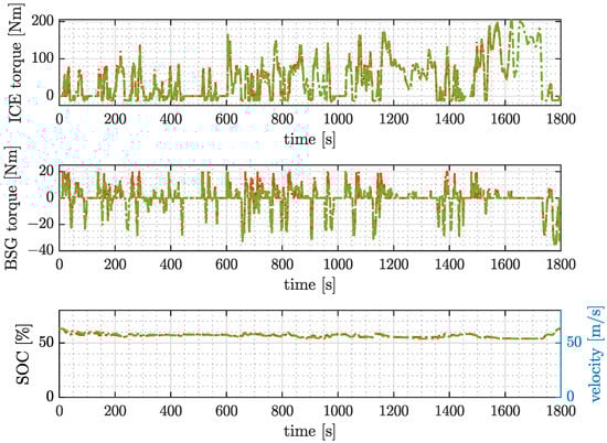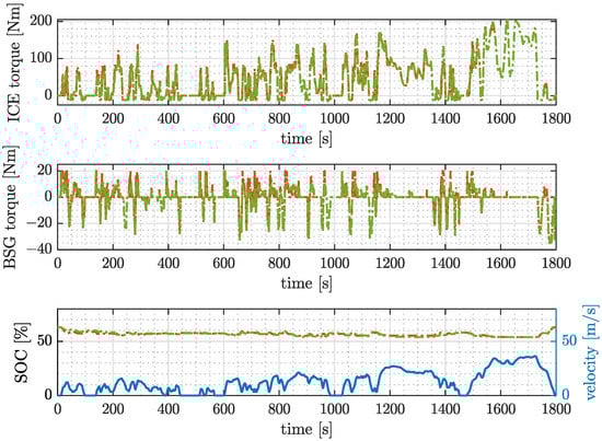 In the case of Belt A, the BDS power loss map with a preload of 350 N was used for simulation. The equivalence factors of ECMS-BDS ( and ) and standard ECMS ( and ) were obtained from GA optimization. Figure 15 shows the time series plot of standard ECMS and ECMS-BDS, where the first and second rows represent ICE and BSG torque, respectively. The ECMS-BDS makes a different torque splitting decision than the standard ECMS. This is due to the fact that the ECMS-BDS includes the BDS map. As for the SOC, the third row of Figure 15 shows that the two controllers ensure charge sustaining.