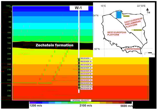 Presented data were acquired in 2016 in Poland as a part of a shale gas exploration project called “Polish Technologies for Shale Gas”. Walkaway VSP data acquisition was performed during very harsh weather conditions in November. The W-1 project was located in the Northern Poland Kashubian Lake District []. It is also a part of the Eastern-European Precambrian Platform. A more detailed description is the central-western part of the Baltic Syneclise, located at the eastern side of the Łeba elevation []. The terrain morphology is mainly related to glacial processes. The young glacial nature of the moraine plateau with frequent frontal hills (with an absolute height of nearly 160 m measured depth from ground level (MDGL) as well as a relative height of approximately 30 m) and many glacial gutters (often with lakes) is common in the studied area. The main river in this region is the Wierzyca river, where numerous peat-boggy depressions are present []. On the crystalline rocks, Permo-Mesozoic and Lower Paleozoic structural complexes occur. Deposition starts with alluvial sediments (with alluvial fans) of the Żarnowiec formation (Lower Paleozoic). Along with Lower and Middle Cambrian sediments, they are counted as one big meso-sedimentary complex. The presence of Upper Cambrian rocks is very rare as, in general, they are incredibly eroded. Ordovician and Silurian rock complexes are placed directly on the Cambrian layers. Both hold many breaks initiated by changing conditions between erosion and sedimentation periods. Zechstein’s formation of evaporites rocks is a part of the Upper Permian complex. These rocks are known for their properties, which are a significant obstacle in the geophysical recognition of rocks lying beneath them []. The Mesozoic series starts with Lower Triassic sediments of sandstone, claystone, and mudstone. Carbonate intercalations often occur in this series. Directly over these rocks, the Muschelkalk is present (Middle Triassic). It consists of dolomite, marl, and limestone. Cretaceous deposits are located successively. Lower Cretaceous consists of marly limestones and glauconite sandstones, whereas Upper Cretaceous consists of marls. Miocene formations represent tertiary rock sediments (mostly marly clays and sand silt). Quaternary rocks are exemplified by gravel sediments and glacial sand with frequent pebbles []. In the W-1 survey region, the three main sealing complexes were distinguished. Ludlow and Pridoli complexes are made of claystone and silt with an extremely low permeability and porosity. The Zechstein sealing complex is very thick—in some places, the thickness is over 400 m. This formation is built of anhydrite and salt with a very high P-wave velocity (average 6000 m/s). The location of the W-1 well and the velocity model used for the seismic depth migration is shown in Figure 1.