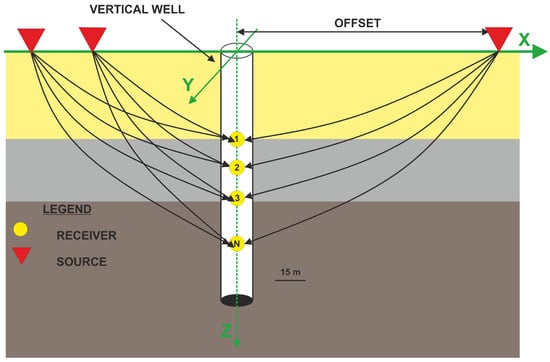 In the case of VSP studies, the sources of elastic waves are located on the Earth’s surface at certain distances from the borehole, along with the profile. The receiver or receivers are located inside the borehole and usually record the field of P-waves and shear waves (Figure 2).