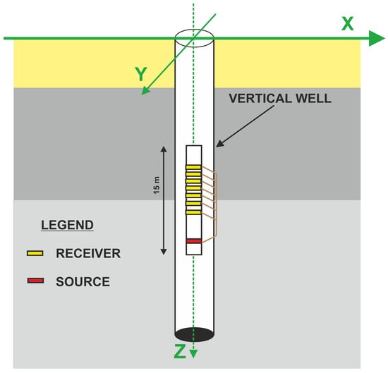 The dipole sonic tool is able to measure velocities of P-, fast, and slow shear waves directly in the well. Sources and receivers are distributed on one device (Figure 3). Due to higher wave frequencies than those emitted in VSP, it is possible to obtain a relatively higher measurement of the vertical resolution. On the other hand, the range is limited to a small zone around the borehole [].