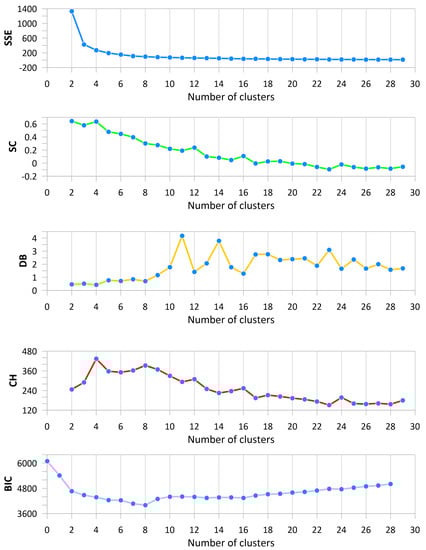 The Davies–Bouldin index (DB) is based on the similarity between clusters that are supposed to have a data density that is decreasing with the distance from a vector characteristic of the particular cluster. This method was described by Davies and Bouldin in 1979 []. A better result is obtained for clusters that are characterized by a lower dispersion and greater distance between clusters. On the graph, the values that are closer to zero represent the optimum number of clusters. It should be remembered that the index is overstated for convex clusters compared to clusters characterized by a different structure, and the use of the distance measure forces the limitation to the Euclidean space. The DB is calculated using Equation (8):