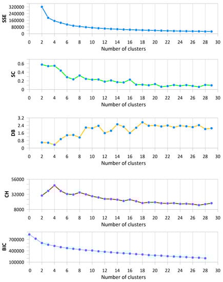 We used the silhouette coefficient (SC) Equation (7), which shows the similarity between particular points within the particular cluster to the points in this cluster and how much they differ from points in other clusters. The silhouette coefficient range is from −1 to 1, where −1 indicates the worst number of clusters, and 1 indicates the best number []. SC is calculated according to this formula []: