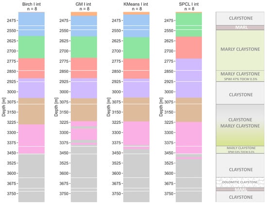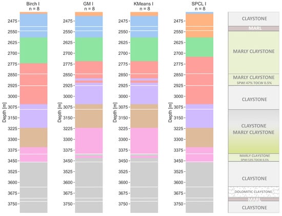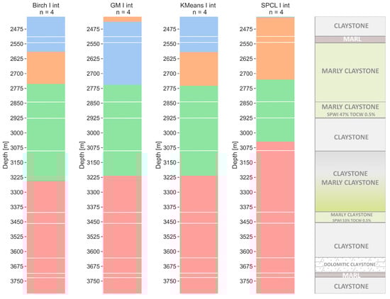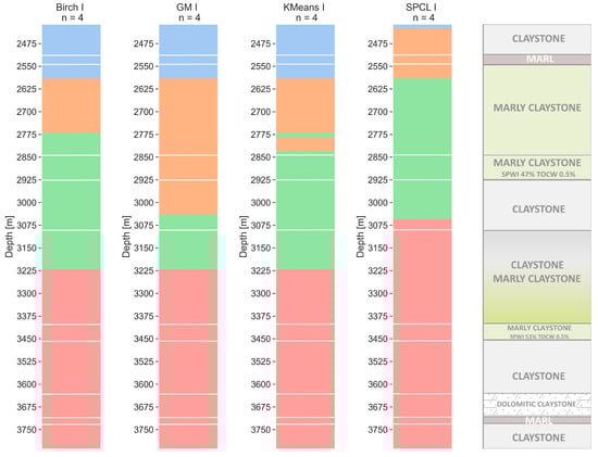 For both resolutions—walkaway VSP (Figure 8) and the sonic one (Figure 9)—consistent models were obtained with small but important differences. The models obtained from the dataset with the walkaway VSP resolution (Figure 8) in general diversify the marly claystone layer in honor of marl and claystone. The thickness of the first three layers is similar for all models. Layers 4 (red) and 7 (pink) show the greatest diversity in terms of thickness. Similar results for these layers are obtained in the pairs of SPCL–BIRCH and GM–k-means. What is important is that the GM and k-means showed clusters within potentially saturated layers (depth of 2900 m MDGL and 3400 m). The sonic resolution models (Figure 9) for BIRCH, GM, and k-means are very consistent. The significant difference begins only at a depth of 3225–3525 m MDGL. The SPCL model is also quite similar to the others; however, a clear division within lithological types is noticeable. For BIRCH, GM, and k-means, the division on marl and claystone in both marly claystone layers is again visible. Only the models from GM and k-means showed a potentially saturated layer, with a depth of around 3400 m MDGL; however, k-means gives slightly more balanced and accurate results here.
