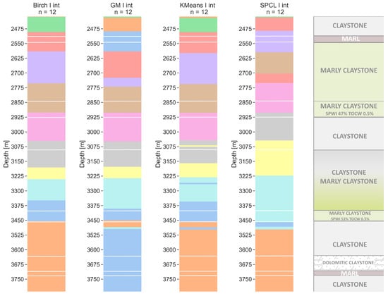 The number 12 is similar to the number of layers determined from the core analysis in the Silurian complex. For the walkway, the VSP resolution (Figure 10) results are similar to those obtained with n = 8. For all four models, the clusters are quite similar, but the difference for SPCL is again the greatest. For the walkaway VSP resolution, the last cluster for all models starts at a depth of 3450 m MDGL which is the boundary between different Silurian epochs. GM, k-means, and SPCL are sensitive to the thin saturated marly claystone layer (between 2850 and 2925 m MDGL), whereas BIRCH does not divide this layer. The second potentially saturated layer is not properly divided in all models (too thick). For sonic resolution (Figure 11), the models are far less consistent with the walkaway VSP resolution than they were for n = 4 and n = 8; however, there is still a good similarity between them within the sonic measurement step. BIRCH and k-means here are very similar. The model obtained with BIRCH is the most homogeneous, while the k-means show many local thin clusters. SPCL and GM are similar at depths of up to 3075 m MDGL. The internal differentiation of the first marly claystone layer is important here. SPCL shows a thin cluster below the bottom of the second saturated marly claystone, whereas BIRCH and k-means showed that this layer was too thick. On the other hand, the GM model matches with the top and bottom of this layer exactly. Again, in no scenario in terms of resolution and for any model can we see a clusters’ separation for depths greater than 3500 m MDGL.