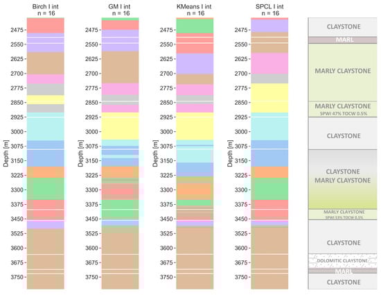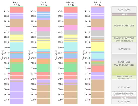 Models for 16 clusters are more difficult to interpret. The differences between walkaway VSP (Figure 12) and sonic (Figure 13) are higher than for n = 4, n = 8, and n = 12. On the other hand, models within a particular resolution are consistent. All four walkaway VSP resolution models show an internal division of the first marly claystone layer, similar to that obtained for the sonic resolution when n = 12. The first layer of saturated marly claystone is divided among all four models; however, the GM, k-means, and SPCL show that this layer can be divided into thinner ones. Very good results (again for all four models) are obtained for the top of the claystone and marly claystone layer (depth of 3075 m MDGL). The walkaway VSP resolution models show that there is no gradual transition from claystone to marly claystone, but this complex has a clear separation layer at a depth of 3150 m MDGL. For all four models, the second saturated marly claystone layer is thicker than that from the core analysis. For GM and k-means, there is a thin cluster at a depth of 3252 m MDGL. For sonic resolution (Figure 13), the GM and k-means models show a significantly greater variation at depths below 3075 m MDGL, whereas BIRCH and SPCL appear to show more major variations. Again, the marly claystone layer shows greater internal differentiation compared to the core analyses, but of a slightly different nature than those obtained for the walkaway VSP resolution. The k-means algorithm shows the best separation of potentially saturated layers, but within the profile from 2400 to 3350 m MDGL, it is almost identical to the model from GM. Neither method shows any differentiation below a depth of 3500 m MDGL, even though, based on the drill core, a thin layer of marl and dolomitic claystone was separated there within two claystone complexes.