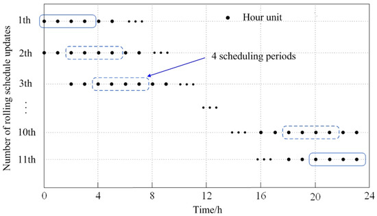 The day-ahead-rolling-realtime compound coordinated and optimal operation strategy of the IES firstly establishes the day-ahead scheduling scheme based on the day-ahead forecast data of electricity, heat load and wind power output, which provides preliminary reference information for the whole day operation of the system. Then, the rolling plan is carried out by using short-term rolling forecast data, the day-ahead plan is modified, and the basic operation point of each equipment output is established. Finally, the real-time planning is carried out by using ultra-short-term forecast data, and a planning scheme with high matching degree with the actual power, heat load and wind power output is obtained. In the compound coordinated optimal operation strategy, the scheduling period of the day-ahead plan is 24 h, and the scheduling interval is 15 min. The time window span of the rolling plan is 4 h, and the update interval is 2 h, and the time window scrolls backward in the planning process, as shown in Figure 2. The real-time plan is executed once every 15 min, and is responsible for arranging the scheduling plan for the next period of time in advance.