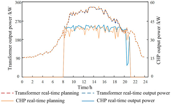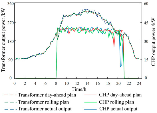 In this case, a multi-time-scale scheduling plan is carried out. Figure 5 shows the comparison curve of real-time planning and actual processing of electric load, and Figure 6 shows the output and actual output of electric load under day-ahead planning, rolling planning, real-time planning and real-time planning, respectively.