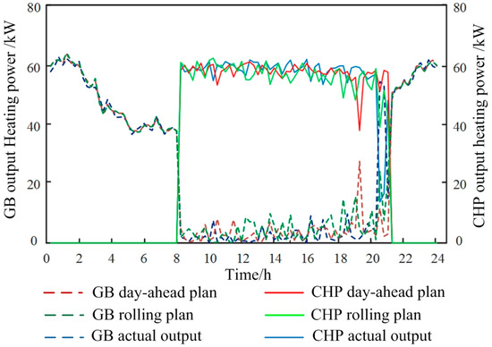 Comparison of day-ahead plan, rolling plan and actual output of thermal power output of gas-fired boilers and CHP.