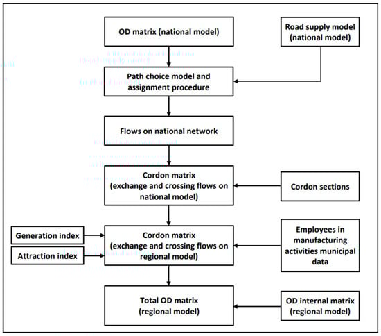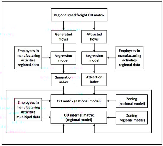 OD matrices between smaller areas can be estimated using a model which relates data from the regional ISTAT matrix to other available data [31], such as total employees, employees in the trade sector, employees in the manufacturing sector, resident population, and so on. Different linear regression models were tested, simple and multiple, using one or more variables and correlating them with the total road freight emitted and the total freight attracted by each region. The best results were obtained by correlating both goods generated and attracted with the average number of employees in manufacturing activities. These data are available from ISTAT with a spatial detail down to a single municipality, and therefore, can be used to refine the OD matrix down to the municipal level.