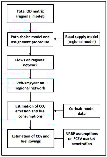 The last phase (Figure 4 and Section 2.3), through the total regional OD matrix and a detailed transport supply model of the Campania region, enables estimation of the vehicle-km/year of freight vehicles. These values will make it possible (Section 3) to estimate the savings in consumption and emissions based on the NRRP assumptions.
