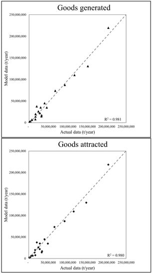 Table 1 shows the data used for calibrating the two best linear models, one for estimating ‘generated’ goods (generation index) and the other for estimating ‘attracted’ goods (attraction index). Table 2 reports the resulting statistical tests. The data in this table should be interpreted as follows: the coefficient of determination measures the model’s ability to reproduce the real data and is better closer to 1; the significance test F is valid if it is close to zero; the Student’s t-test verifies whether the variable used is really significant for the reproduction of the phenomenon and, in the case of a single variable, the test is verified if its value is greater than 6.314. All these indicators are valid for calibrated models that are based on the assumption that the linear regression line passes through the origin of the axes. The scatter plots with data concerning actual values and estimated values are reported in Figure 5. The same approach was already tested by the authors in [5] but referred to province-based zoning of the entire Italian territory.