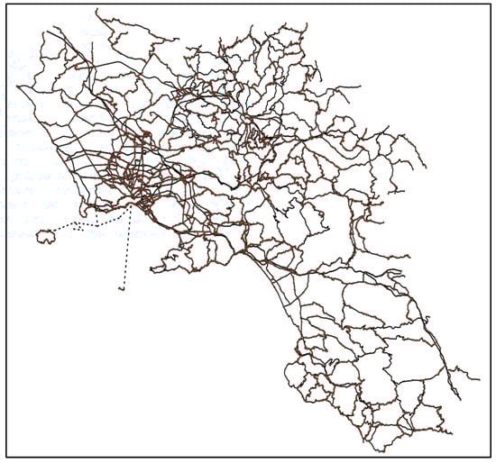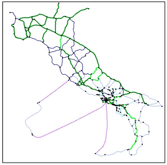 The transport supply model on the national scale was implemented to be congruent with the corresponding zoning, densifying the road network in the Campania region. The corresponding graph (Figure 7) has 368 links and 256 nodes and represents over 22,000 km of roads; the free-flow speeds considered for heavy goods vehicles (HGVs) are reported in Table 3.