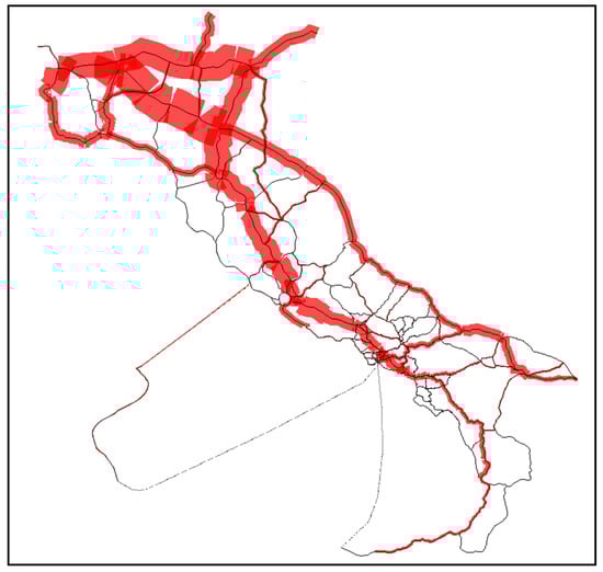 Once implemented, the supply model estimated the transport demand using generation and attraction indices, a deterministic assignment procedure was applied to calculate freight flows, again in terms of tonnes/year, on the national network; the results are reported in Figure 8 and allow us to estimate the flows of exchange and crossing goods with the Campania region, through the generation of a cordon (boundary of the study area) matrix based on the main roads entering the region. These data are necessary for building the whole regional matrix.