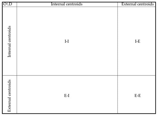 The regional study area was the territory of the Campania; it was partitioned into 551 zones, equal to the number of municipalities (Figure 9). The cordon sections were 10; therefore, the OD matrix had 314,721 cells (561 × 561). This matrix could be divided into four submatrices (Figure 10):