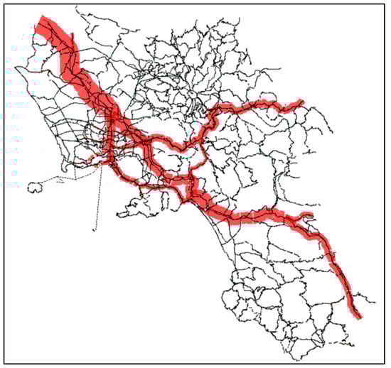 The regional road network model includes more than 22,000 arcs, representing over 7000 km of roads (Figure 11). The network includes all motorways, state and regional roads and the main provincial and municipal roads in the study area. Each road link has been associated with a free-flow speed (for heavy goods vehicles) summarised in Table 4.
