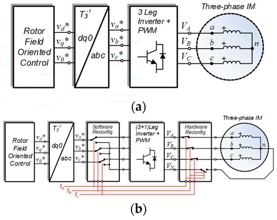 A typical three-phase induction motor drive system connected in a wye configuration and controlled under RFOC is depicted in Figure 2a. The main components of the drive are given in separate modules to elucidate how the control variables would be eventually mapped onto the machine under the healthy and postfault configuration.