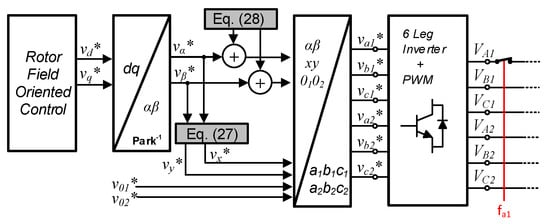 For multiphase machines, analysis is usually performed based on the Vector Space Decomposition (VSD) model [], where the machine variables can be decoupled into flux-and-torque producing α-β components, non-flux-and-torque producing x-y components and zero sequence 01-02 components. The concept of VSD transformation for multiphase machines with different phase numbers has been well-addressed in the literature on multiphase machines [,,] and hence not dealt with further in this paper for brevity. To facilitate the subsequent discussion, a symmetrical six-phase induction machine with is used as a case study to represent a multiphase induction machine. The VSD model for a symmetrical six-phase induction machine controlled using RFOC is given in (20).