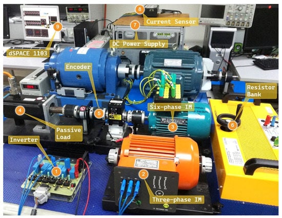 This section demonstrates the results of an experimental test conducted for the effectiveness and robustness validation of the proposed feedforward fault-tolerant control methodology. The experiment is performed using symmetrical three- and six-phase IM drives with the details given in Table 1. As shown in Figure 6, the motors are mechanically coupled with a passive load (1.8 kW PMSM feeding an adjustable resistor bank) and an incremental encoder (resolution 5000 pulse/rev) that is used to feedback on the speed. The phase current of the motor is measured through a six-channel current sensor (based on LEM current transducer). The motors are powered by a six-leg custom-made 12 kW inverter being supplied from a DC power supply (TDK Lambda GEN600-8.5). The RFOC control is implemented on the dSPACE DS1103 digital controller with a 5 kHz switching frequency.