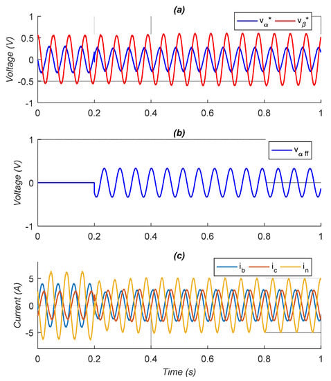 Postfault experimental result for the three-phase IM drive with feedforward injected at 0.2 s: (a) α-β voltage, (b) feedforward voltage, (c) phase and neutral current.