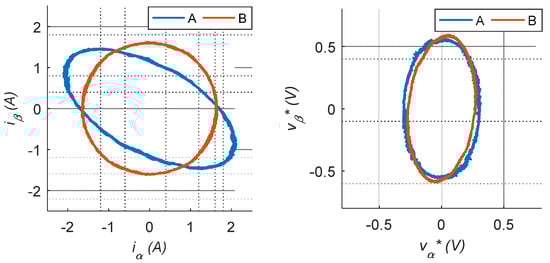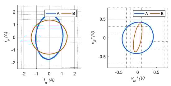 Trajectory of the current and voltage in α-β frame. A: before injection of feedforward, B: after injection of feedforward for three-phase IM.