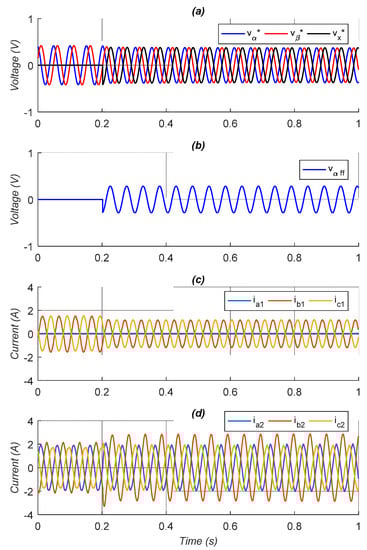 Postfault experimental result for the symmetrical six-phase IM drive with feedforward injected at 0.2 s: (a) α-β and x voltage, (b) feedforward voltage, (c) phase current of set1, (d) phase current of set 2.