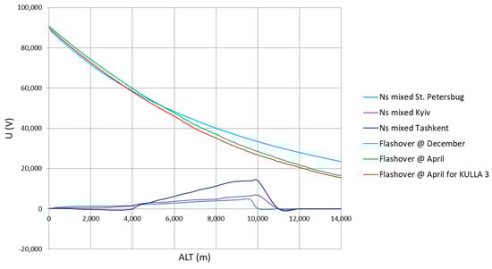 The values of the induced electric field strengths for different kinds of clouds have been taken from [9] and recalculated into voltage by multiplying them with the value of the insulator gap of 0.6 m from the cases of humid flashovers from [13]. Figure 2, Figure 3, Figure 4 and Figure 5 show the comparison of the flashover voltages (upper curves) with the induced voltages on the ascending antenna (lower curves) for the Stratocumulus and Nimbostratus clouds for two wire lengths: 140 m (2022 experiments) and 500 m, for comparative purposes. The ‘positive polarization’ of the cloud indicates that its upper charge is positive and the lower charge negative; the ‘negative polarization’ indicates the opposite charge allocation [7]. The Nimbostratus cloud data have their locations of origin indicated (Sankt Petersburg, Kyiv, and Tashkent). An analogue comparison can be made for the mission’s descent, where the antenna acquires electric charge up to the touchdown, as shown in Figure 6, Figure 7, Figure 8 and Figure 9, also for antenna lengths of 140 m and 500 m. ‘KULLA 3’ denotes the cases where the antenna material absorbs the solar radiation and heats itself up (experiments executed in April, approx. twice the temperature values from the colder case). The blue curves, showing the flashover voltage changes with altitude for the December atmospheric data, begin with an offset in values due to the data registration start at the altitude of 65 m.