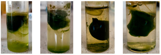 It takes approximately 34–42 days for the granules to mature in static cultivation and aggregate into a spherical or disk shaped structure [9,31]. The size of the granules is within the range of 10–20 mm [25]. To check whether cultivation has achieved success, a shake test is performed and if a granule maintains its aggregated state after the test and the liquid inside the vial has little to no cloud, it is deemed as successful [4,26].