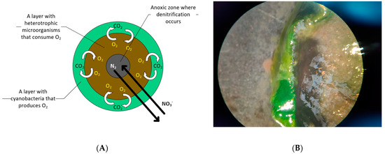 The next figure (Figure 4) presents the approximate structure of an OPG. The inner core of an OPG granule has heterotrophic as well as nitrifying bacteria that perform aerobic oxidation of NH3 and organic substances coupled with CO2 utilization by microorganisms in the phototrophic layer. The denitrification process (reduction of NO3− to N2 gas) also occurs in this region [48].
