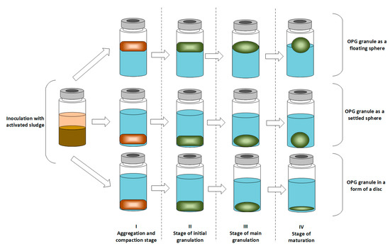 According to the granulation theory proposed by [28] the Inert Nuclei Model, MGs are formed due to the presence of inert material that serves as a place of attachment for bacteria. The same mechanism can also be applied in terms of OPGs. The theory suggests that there are four distinct stages of granulation, i.e., [31]: