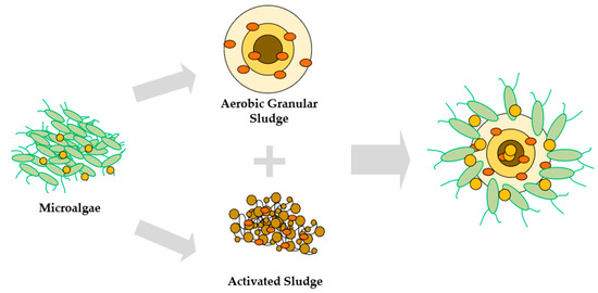 - Jiang, Q.; Chen, H.; Fu, Z.; Fu, X.; Wang, J.; Liang, Y.; Yin, H.; Yang, J.; Jiang, J.; Yang, X.; et al. Current Progress, Challenges and Perspectives in the Microalgal-Bacterial Aerobic Granular Sludge Process: A Review. Int. J. Environ. Res. Public Health 2022, 19, 13950. [Google Scholar] [CrossRef]