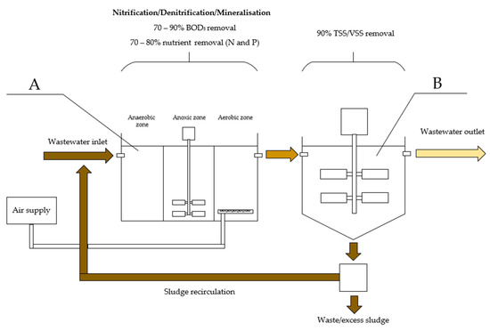 Conventional AS process scheme, based on [65]; where: A—reaction/aeration tank; B—secondary clarifier.