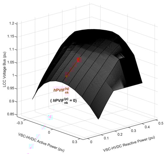 - Hybrid Power Voltage Interaction Factor (hPVIF): As the primary contribution, the factor hPVIF is proposed. From the power–voltage relationship between the LCC and VSC links, and given the length of the transmission line that connects the inverter buses, allows extracting the system operation set point necessary to achieve the maximum ESCR in the LCC link. Knowledge of this point, therefore, includes knowing how far the VSC must be connected from the LCC and setting the values of the active and reactive power coordinates in the VSC for the upper limit for the voltage stability margin in the LCC inverter station. Factor is helpful for the further contribution of the manuscript, i.e., apparent line length; therefore, and complement each other to achieve the objectives of this work.