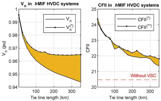 - The electrical system operators’ decisions in the operation programming process are carried out daily, monthly, and annually. In all cases, the programming considers systemic aspects, such as the generation and transmission expansion schedule, the level of the reservoirs, load forecasts, analysis of meteorological conditions in the main river basins of the EPS, and forecasts of inflows to the hydroelectric uses. In this context, as these are aspects closely related to medium and long-term horizons and, therefore, with little or no flexibility for short-term changes, the operation agents need to have a reliable instrument that allows emulating a more advantageous value for the ESCR seen by a given LCC-HVDC. From the proper choice of VSC-HVDC set points, the apparent line length concept presented in Section 5.1.2 allows for the emulation of a shorter line length than the actual length, resulting in a higher value of ESCR.