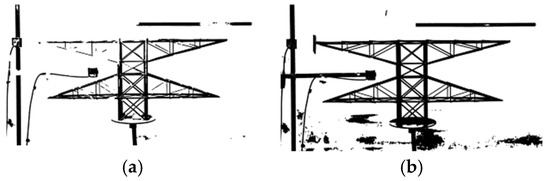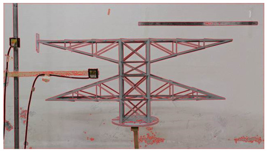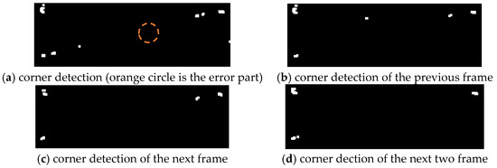 The results of the Harris corner point detection of the transmission tower were subjected to expansion + corrosion operation. Under the original video conditions, the transmission tower model background was a wall, which is relatively single and less noisy. The effects before and after the expansion + corrosion treatment are shown in Figure 10a,b. Compared with the median filtering + sharpening method, the noise was significantly reduced by applying the expansion + erosion method, and the contour corner points in the region of interest were more obvious, as shown in Figure 11a.