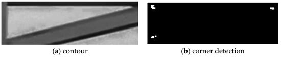 Under the condition of white noise with mean μ = 0 and variance σ = 0.05 applied to the image, the corner points, processed by the expansion + erosion method, were more clearly as shown in Figure 10c,d. The corner points processed by the median filtering + sharpening method had the situation that the contour corner points in the region of interest were mistakenly deleted, and the error was larger, as shown in Figure 11b.