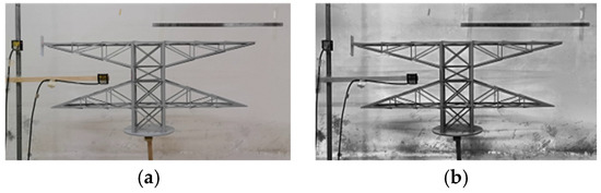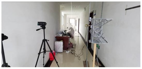 A model of a transmission tower pedestal was constructed with a laser sensor, model HL-G112-A-C5, mounted on the side of the model (Figure 3). The vibration displacement of the model was monitored at a frequency of 1000 Hz, which would be used as a comparison group. Meanwhile, a camera was placed in front of the model to capture the vibration video, with a recording frequency of 60 fps and a resolution of 4096 × 2160. Adopt the ROI key point method for displacement monitoring, and the selected experimental samples were HS-33 (normal) and HS-42 (non-uniform illumination). The artificial noise was white noise with a mean value μ of 0, and the variance σ was selected according to the noise magnitude.